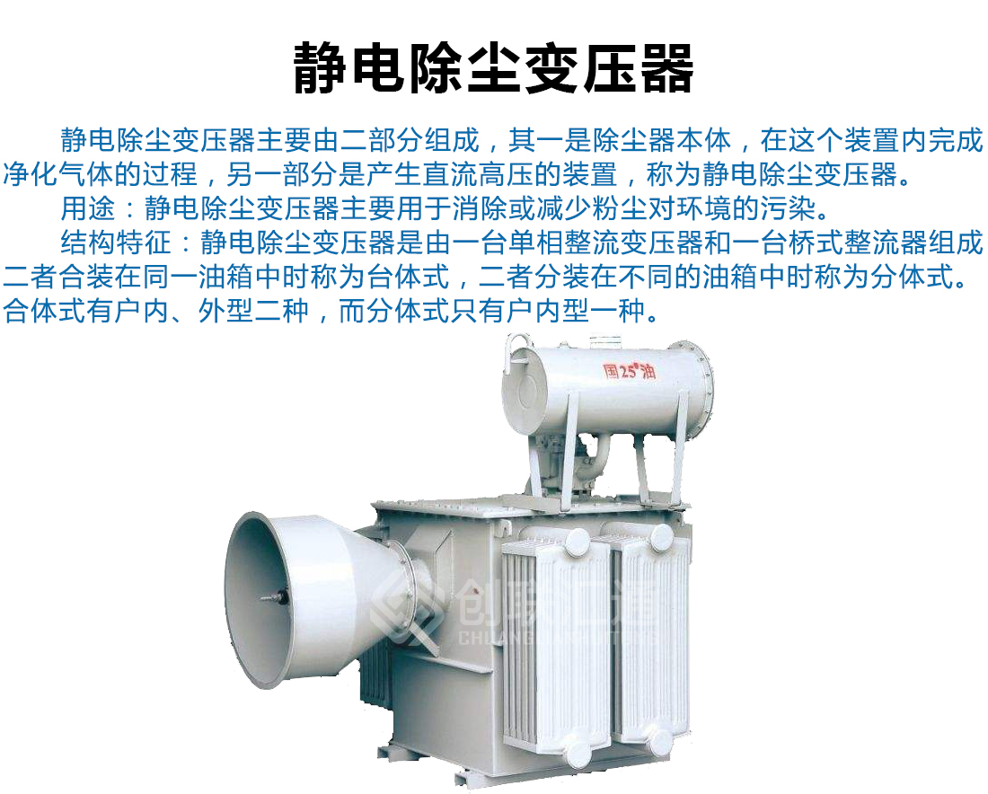 靜電除塵變壓器是由一臺單相整流變壓器和一臺橋式整流器組成。二者合裝在同一油箱中時稱為臺體式,二者分裝在不同的油箱中時稱為分體式。合體式有戶內(nèi)、外型二種,而分體式只有戶內(nèi)型一種?! ∽儔浩髯陨頌楦咦杩棺儔浩?。高壓硅堆采用雪崩高壓硅堆,抗沖擊能力強,反向擊穿后能自動恢復(fù)。采樣電阻采用可靠性很高的產(chǎn)品。變壓器高壓交流端與高壓硅堆采用全橋接線方式。